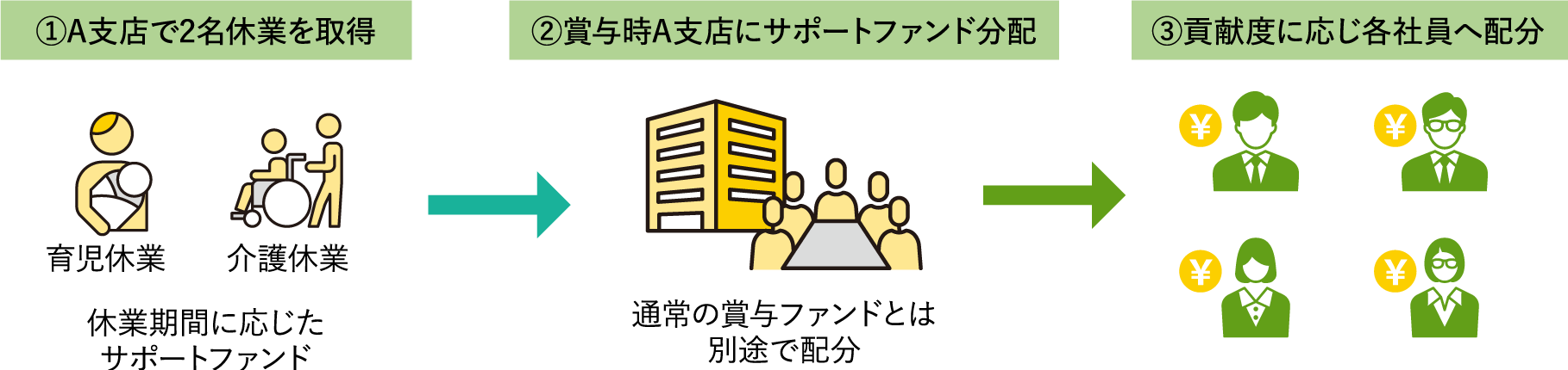 育児・介護等に直面した社員が気兼ねなく、休業や短時間勤務、週休3日制度を利用できるよう、制度利用者をサポートした社員へ賞与とともに還元する仕組みを設けています。利用する側もサポートする側も安心できる職場環境づくりを行っています。