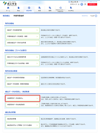 ご依頼の内容は、総合振込または給与・賞与振込「作業内容選択」画面の[振込データの状況照会]ボタンから確認することができます。