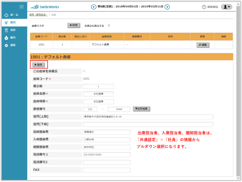 ③ 倉庫名称や所在地、同倉庫の担当者情報などを変更し、「登録」ボタンをクリックします。